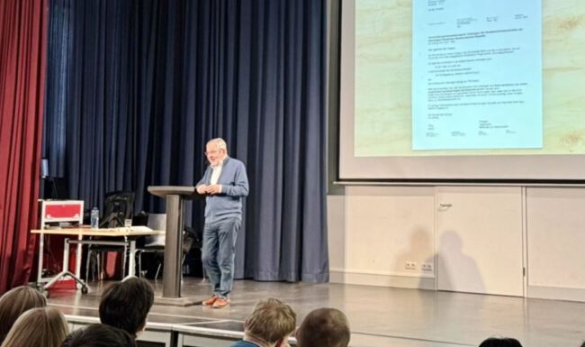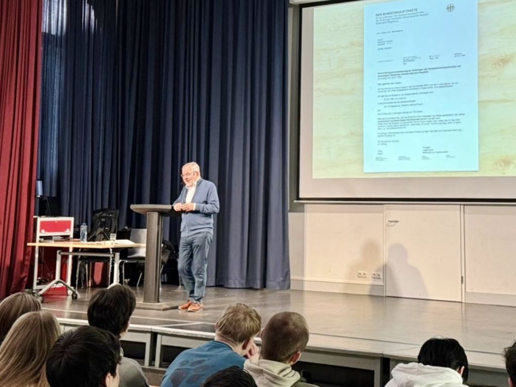 Nachdem unsere Schülerinnen und Schüler im ersten Halbjahr das Thema ‚Krise in der DDR’ anhand von Text- und Bildquellen sowie Verfassertexten erarbeitet hatten, wurde nun Geschichte lebendig: Manfred Casper besuchte uns mit freundlicher Unterstützung der Konrad-Adenauer-Stiftung. Er berichtete in seinem Vortrag ‚Freiheit um jeden Preis – Eine Jugend in der DDR‘ eindrücklich von seiner Biographie. Aufgewachsen in der DDR erlebte Casper eine behütete Kindheit und Sommerferienbesuche bei der Oma in Braunschweig, bevor er nach vielen prägenden Erfahrungen zum Systemkritiker wurde, der das Land verlassen wollte. Insbesondere seine Schilderungen des gescheiterten Fluchtversuchs, der anschließenden Inhaftierung und auch der Konsequenzen für sein Leben in der Bundesrepublik nach einem „Freikauf“ unter engmaschiger Kontrolle der Stasi waren bewegende Einblicke in seinen Kampf um Freiheit.
